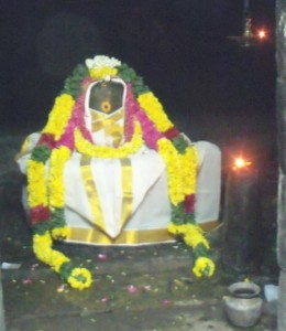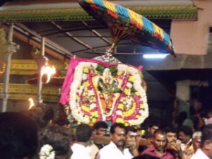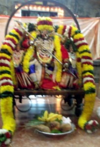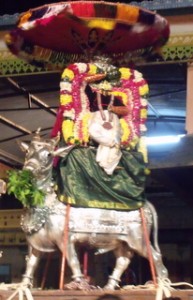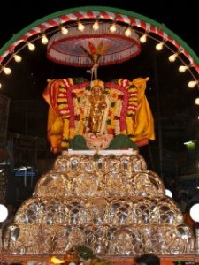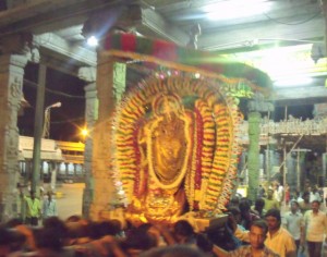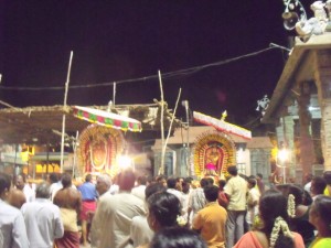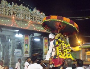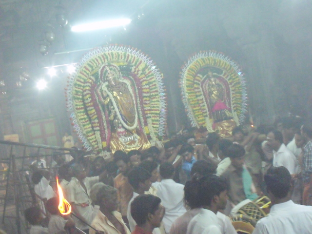 processions of the deities starting from the big temple and going on the four streets around the temple. The Utsava Murthis are Sri Mula Nayakar (Shiva in the form of Somaskanda), Tani Ambal (the independent goddess) and Sundaramurthi Nayanar (one of the main tamil saivaite saints).