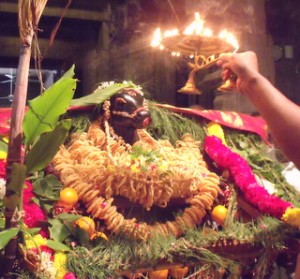 which, in India, falls on the 17th of July. It follows the traditional course of an Utsavam (temple festival). Each day in the morning at sunrise and in the evening at sunset, the different gods of the hindu pantheon are taken out on procession. The yagasala is opened since the