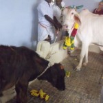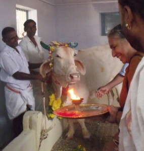 ‘Goshalai’. Inside, it was spotlessly clean and beautifully decorated with flower garlands and sugar cane and turmeric plants. In the centre, a lovely white cow (believed to be the descendant of Lakshmi) and her calf and another black cow were decorated and honoured. A puja was performed to them by the ashram priests with the same respect and energy as they would to a deity in the temple. The white cow was fed with sweet pongal from the president’s own hands and seemed to be quite content