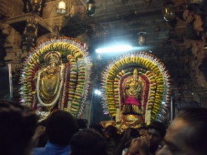 majestically doing His swan-dance, that She submits to Him and wishes to be re-united. Thus the reconciliation and reunion of the gods take place and to synchronise this, both the deities are brought together and placed on the same pedestal and the priests perform an Arathi puja waving and encircling one flame around both of the deities to signify the restoration of harmony.continue reading