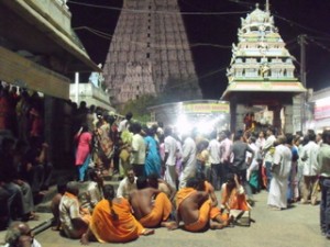 In the afternoon, the deities of Shiva and Parvathi are turned to face the mountain. In front, the priests place two pots representing the divine couple and 8 pots representing the Vidyeshwaras and then kindle a small sacrificial fire in the centre. After this a grand puja involving many abhishekams and aarathi are performed to all the deities. The next day the ceremony which consists of tying a turban around the head of the son of the deceased takes place inside the big temple.The name of this ceremony is ‘thalaikattu’ but in this case since it concerns Shiva, it is called ‘makutabhisheka’ (consecration of crowning). In the absence of a human king in Tiruvannamalai (except during the brief Hoysala period) the sovereignty over this kingdom is thus transferred to Lord Shiva himself. And verily so! For is not Arunachala the majestic and omnipotent ruler of this realm and every realm ?