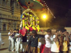 commemorate the time when Shiva and Parvathi were in discordance. Nevertheless, it finishes with the divine union and brings them both back together in harmony. On the first day, there are three processions of the deities starting from the big temple and going on the four streets around the temple. The Utsava Murthis are Sri Mula Nayakar (Shiva in the form of Somaskanda), Tani Ambal (the independent goddess) and Sundaramurthi Nayanar (one of the main tamil saivaite saints).The most interesting part of the festival takes place in the