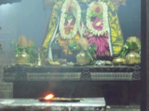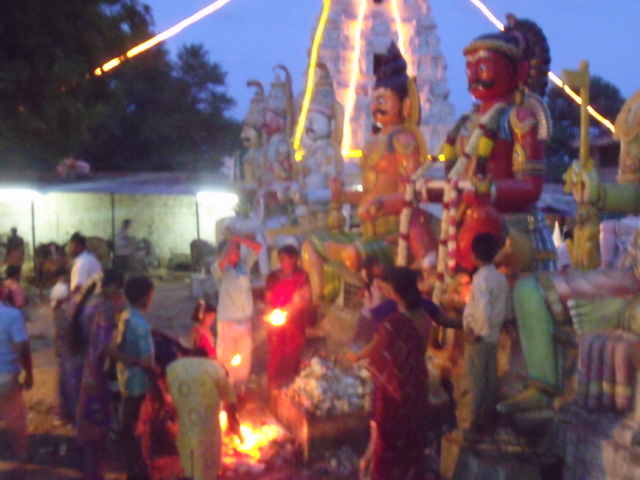 to light lamps to the Goddess and to offer turmeric and vermillon as a homage to her eternal Sumangali-hood. The women also burn lamps and offer rice puddings and fruits to the huge guardian deity idols who stand in array and form quite a majestic arena in the outer courtyard of the temple. After