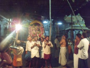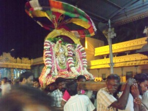 worshipped with camphor Aarthi and borne outside and mounted on a chariot which takes a different form each day (elephant, lion, 5 headed serpent, peacock etc). Finally, She goes on procession right upto the outer girivalam path near the town bus stand and Here She stands for a while granting darshan to all passers by.
