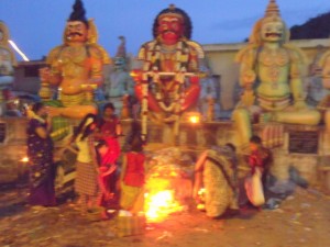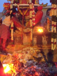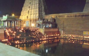 during this whole month. Mondays are specially dedicated to Shiva and the Karthigai Somavara Vritham is observed by many traditional devotees where-in they fast and do giri pradakshina and then offer special pujas to the Lord. Karthikai Maasam is also known for the deepams or lamps that are lit in every household and even in shops and business concerns at sunset every day. It is a lovely sight to walk down the streets after dark and see the numerous fire lamps glowing bravely at the entrance of every abode. Another special event of this month is the Mahabharani which is observed in all Shiva temples by lighting bonfires. It just precedes the Karthigai Deepam.