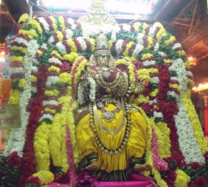 bangles (valaiyal) to the Goddess. The priest places the bracelets on Her arms and then returns them to the women as prasad. Rudram is chanted by the Vaidikas (brahmin vedic scholars) all the while. And thus the festive month of Aadi draws to a close and with these final two festivals it is believed the Mother Goddess to whom this month is consecrated, would have been ideally propitiated and Her blessings would be abundantly showered.