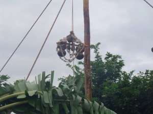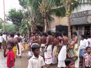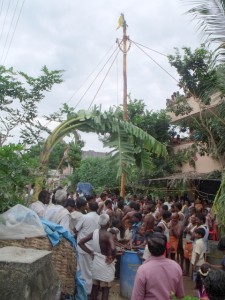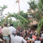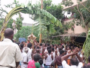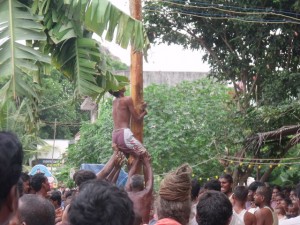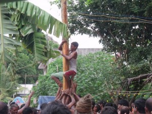 the village people under the name of “Uri Yadi Vizha” literally meaning ‘Beating the pot festival’. A high pole is erected in the centre of the village square. On the high end of the pole hangs the booty, many earthenware pots with money and sweets stashed inside. The sides of the pole are rubbed down with butter making it difficult to climb. The celebration takes the form of a contest. All the able bodied young men of the village, especially those of the Yadava community, vie with each other to climb up the slippery pole and hit the pots with a stick and break them, thus winning the prize of money and sweets that is contained inside.
