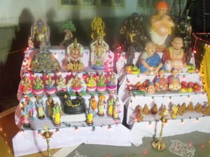 pantheon displayed according to mythological order on a range of wooden steps called the Golu padi which often number 5, 7 or 9. Children are usually on holidays at this time and take a lot of interest in this arrangement. They go about dressed as Radha or Krishna to participate in different Golus and sing bhajans in favour of the Goddess. The traditional prasad distributed is Sundal, a dish made of many sorts of grams and pulses cooked and seasoned tastily.