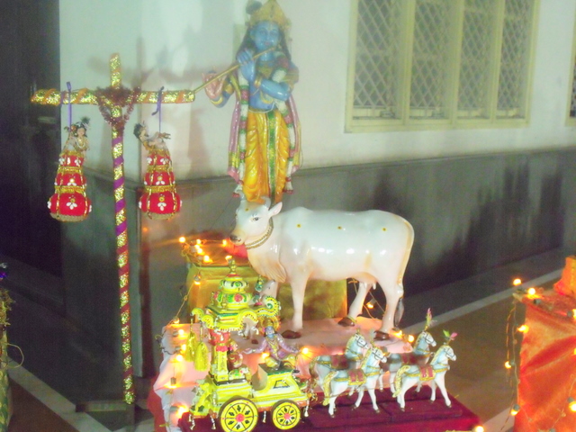 kolams were drawn in front of each array of gods and brass lamps were burning with prasad offerings placed in front. Apart from this, there were lovely golden serial lights strung everywhere to give a festive aura to the whole show.The various Leelas of Sri Krishna were depicted in