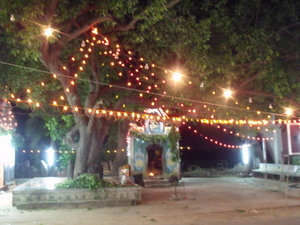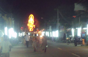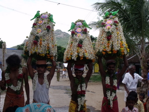 decorated with banana and palm fronds and shiny coloured lights are strung everywhere. There are also enormous lighted cut-outs depicting the Goddess which blaze at night and strike the attention of every passer-by.This week in the village of Adi Annamalai, the Kooluthal festival was celebrated on a