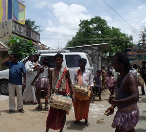 grand scale. The morning after the distribution of the Kool, the ritual with the karagam dancers was performed. This involves a group of male dancers, some with flower-decorated pots balanced on their heads, musicians of three sorts, a few with drums, some others with waving cymbals and more others with