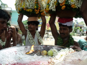 solistice which, in India, falls around the 17th of July. It takes place on the usual course of an Utsavam (temple festival). Even though the meaning of the festival is not very explicit, one can eventually glean the cosmic dimension in it, for, at this time of year such a festival seeks to define the auspicious period in which the idea of death leading to ascension is highlighted in a most subtle way.Each day in the morning around sunrise and in the evening around sunset the different gods of the hindu pantheon are taken out on procession. The yagasala is opened since the first day and two kalasams representing the Sun