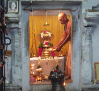 to stand on the threshold and bend your head really low in order to take a glimpse of the deity shining brilliantly deep down inside.The Lingam itself is huge and very ancient and the alamkaram or the decoration of the Lingam is surpassingly beautiful and takes