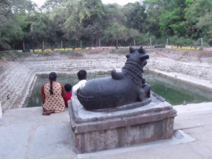 girivalam path. It is located in a very pictoresque spot on the border of the innerpath forest and thus has an abundance of lovely old trees all around. The theertham has two Nandi statues flagging the entrance steps which lead down to it and also a cute little Ganesh shrine with a smiling sadhu priest who looks like a sweet chimpanzee. This seems to be quite an idyllic place and often romantic couples come to sit here and enjoy the view.On the opposite side there is a shrine to the