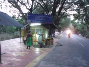 the title of Muthu Mariamman, a tamil name for goddess Parvathi. Of recent years this little shrine has become quite popular and on Sundays there is quite a crowd of devotees here especially vehicle owners who like to get their cars and trucks blessed with a little puja involving lemons and camphor flame.