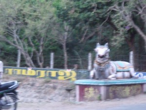 Yama Lingam is located appropriately beside the cremation grounds and cemetery on Chengam road about 2 kilometres after Ramanashramam. Every time there is a death, the mourners offer an Abhishekam to the Yama Lingam after cremating the corpse. This is a usual practice. Apart from funerals and the full moon crowds, this Lingam does not seem to have any regular devotees and presents quite a deserted appearance at other times.