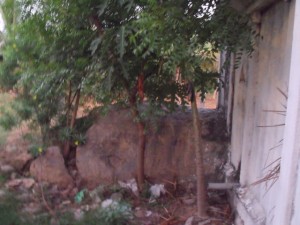 many gods and goddesses from the hindu pantheon. The arrangement of the deities seems to have no rhyme or reason and just seem to be placed here and there with no adherence to vedic rules regarding the placement of deities in a temple nor to any taste of interior decor. Beside the entrance, under a neem tree, is a cement sculpture of a huge 5