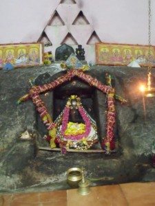 non-twistable head) carved on the front surface of a fairly long natural rock formation. The rock itself is so long that the two ends can be seen extending outside of the concrete structure housing the shrine. The Sadhu priest is earnest to show us the place on the rock where the earlier twisting-removable head used to be. This is now a depression in the rock on the top surface and is