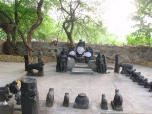 said to be a manifestation of Lord Shiva and worshipped under this title by tribals and jungle dwellers. He is a guardian deity and his temples are usually found in the woods and other forest areas. He is often worshipped inside a natural glen of trees surrounded by rocks and all around him are stone sculptures of many wild animals who form his faithful band of followers. And of course, as is the tradition for guardian dieties, one or two stone horses are kept close by in readiness for him to mount and ride like the wind on any rescue mission for his devotees when they need his protection.