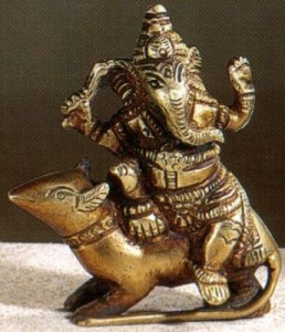 Shiva sat on the top of Mount Kailasam with Parvathi, holding a wonderful fruit in his hand. Seeing the fruit, both the sons of Lord Shiva, Ganesh and Subramanya each asked their father Shiva to give it to him. To this Shiva said that he would give the fruit to whoever of them got back first after going round the whole world. With confidence and pride that he would win the race, Subramanya started immediately riding on his favorite mount, the peacock and began going at a fast pace, frequently looking behind to assure himself that his elder brother Ganesh was not following. What could poor Ganesh do, with his huge belly? His mount was after all a mouse. So he thought it was no good competing with Subramania in the race around the world, and instead went around his parents Lord Shiva and Goddess Parvathi, bowed before them and claimed the reward. When they asked him to justify his action he replied, “All the worlds are contained within you; so if I go around you, it is as good as going round the whole world.” Pleased with his reply, Shiva gave him the fruit and Ganesh started eating it with pleasure.