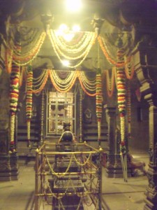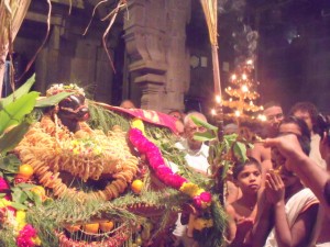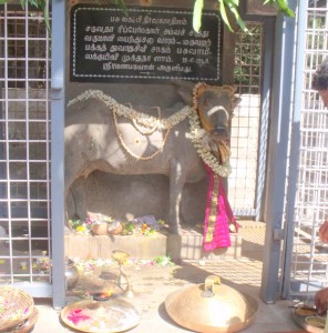 different ceremonies. First the Nandi (bull mount of Shiva) in the Mother’s shrine is decorated in a spectacular way. He is adorned with garlands of vegetables, fruits, sugarcane, grass, flowers. Vadais and other tasty sweetmeats. Then an elaborate Aarathi puja is performed by the priests with devotees looking on with rapt admiration. The next event takes place at the Samadhi (tomb) of the cow Lakshmi which is located outside in the open