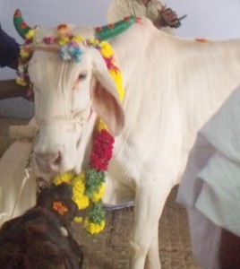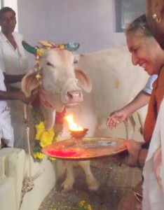 ‘Goshalai’. Inside, it is nicely cleaned and beautifully decorated with flower garlands and sugar cane and turmeric plants. In the centre, a lovely white cow (believed to be the descendant of Lakshmi) and her calf are decorated and honoured. A puja is performed to them by the ashram priests with the