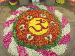 splendid floral decorations over the samadhi shrine and in front of Ramana’s statue in the new hall. They were made with real flowers and had been arranged very beautifully, thus drawing the eye of every devotee who entered the hall. It must have taken a lot of painstaking work for many hours and one cannot but exclaim in praise of the wondrous beauty of these flower festoons and kolams which transformed the plain hall into a place of splendid celebration.