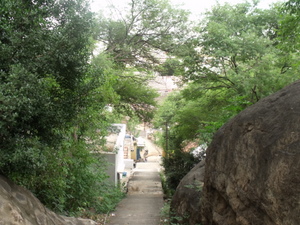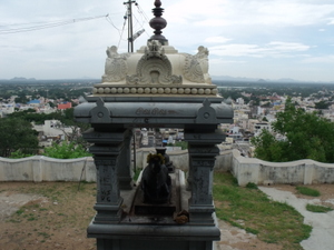 earns its name because the rays of the rising sun are supposed to turn the whole rock to a lovely coral red. This less-known temple can be approached from the town through a little street leading off the Durgai Amman Kovil road about a kilometre after the main bus depot. There is a good stone staircase hewn against the rock to climb up to the temple.