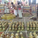 Lord Shiva are heaped in the side aisles for the alamkaram to the Gods. Fruits of the trinity, mangoes, bananas, jackfruits and also pomegrenates, dates and coconuts are brought in baskets. The Brahmin Archaka