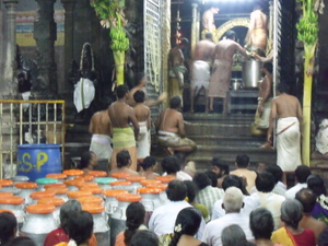 priests work with tireless energy carrying the hundreds of pots to the pedestal where they are received with devotion by the Gurukkal brahmin priests who then bathe the gods elaborately with the different elements. The devotees who are assembled to watch