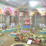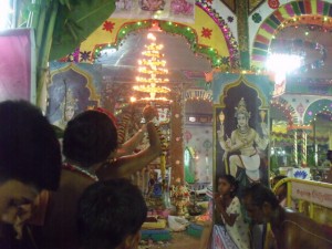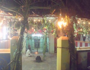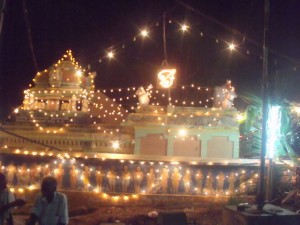 saints’ birth anniversary. The whole external structure of the temple was decorated splendidly with golden lights and inside the shrine, abhishekams were performed to the shivalingam and to the statue of the saint himself depicted in the position of playing a veena (since he was known for his musical talents in vocal singing and