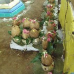 an impressive array. There are about 5000 litres of milk in cans. Hundreds of pots of sandalwood paste, ghee, curd, honey, turmeric and rose water are kept in front of the deities. Flower garlands and flowers dear to Lord Shiva are heaped in the side aisles for the alamkaram to the Gods. Fruits of the