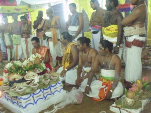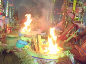 pouring of sacred water from the great vessel. This type of ritualistic pouring of water dates back to hundreds of years to post-vedic times when temple rituals were formalized. During the vedic period, deities were invoked and propitiated in great rituals of fire sacrifices such as yagnas and homas, which were performed in the open. After this