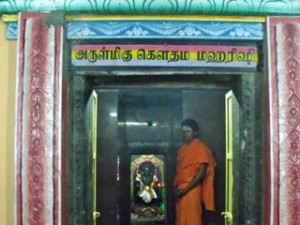 statues of some lesser deities. Leading from this, a small ante-chamber opens to the main shrine where-in stands the deity of Gautma Maharshi in the form of an ancient stone sculpted figure with a very fine, venerable head seeing which one feels obliged to bow and pay obeisance to this great saint of yore.